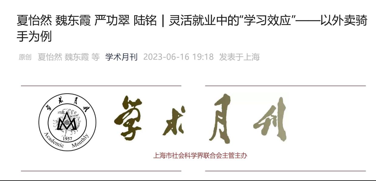 近期,3044永利夏怡然教授以第一作者身份与广东金融公司魏东霞教授、上海交通大学严功翠老师、上海交通大学陆铭教授合作在人文社会科学北大核心、CSSCI、AIM权威和社科基金资助期刊《学术月刊》上发表题为《灵活就业中的“学习效应”—以外卖骑手为例》的论文。