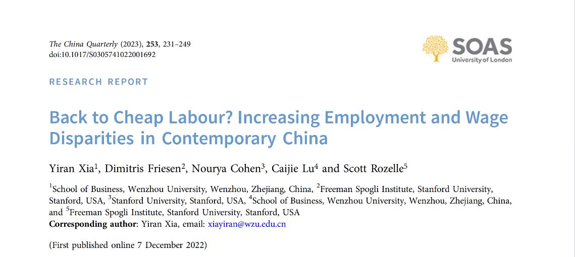 3044永利夏怡然教授以第一和通讯作者身份,和斯坦福大学的罗斯高(Scott Rozelle)教授团队合作,在区域与中国研究领域SSCI权威期刊The China Quarterly发表题为《Back to Cheap Labour? Increasing Employment and WageDisparities in Contemporary China》的论文。