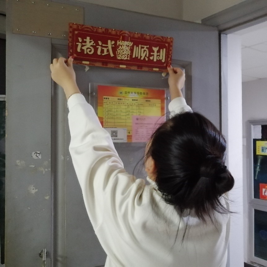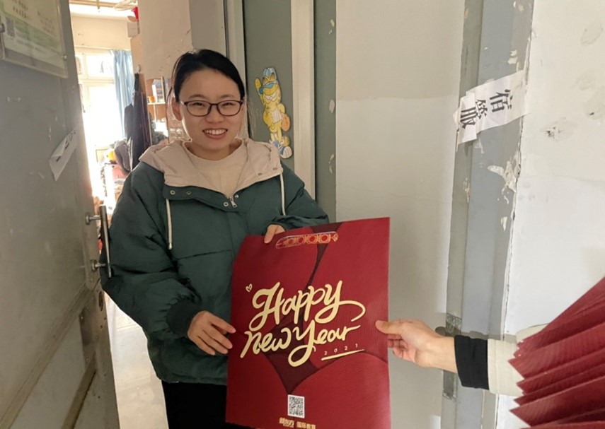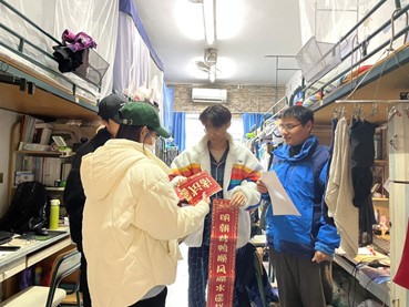 员工党员们纷纷手持印有“新年快乐”、“诸试顺利”、“福”等标语的卷轴,分组进入新生宿舍,向同学们表达问候和祝福。同学们面对员工党员热情洋溢的祝福,个个眉开眼笑,纷纷鼓掌表示感谢。寝室内充满着欢声笑语,到处洋溢着欢乐的新年氛围。