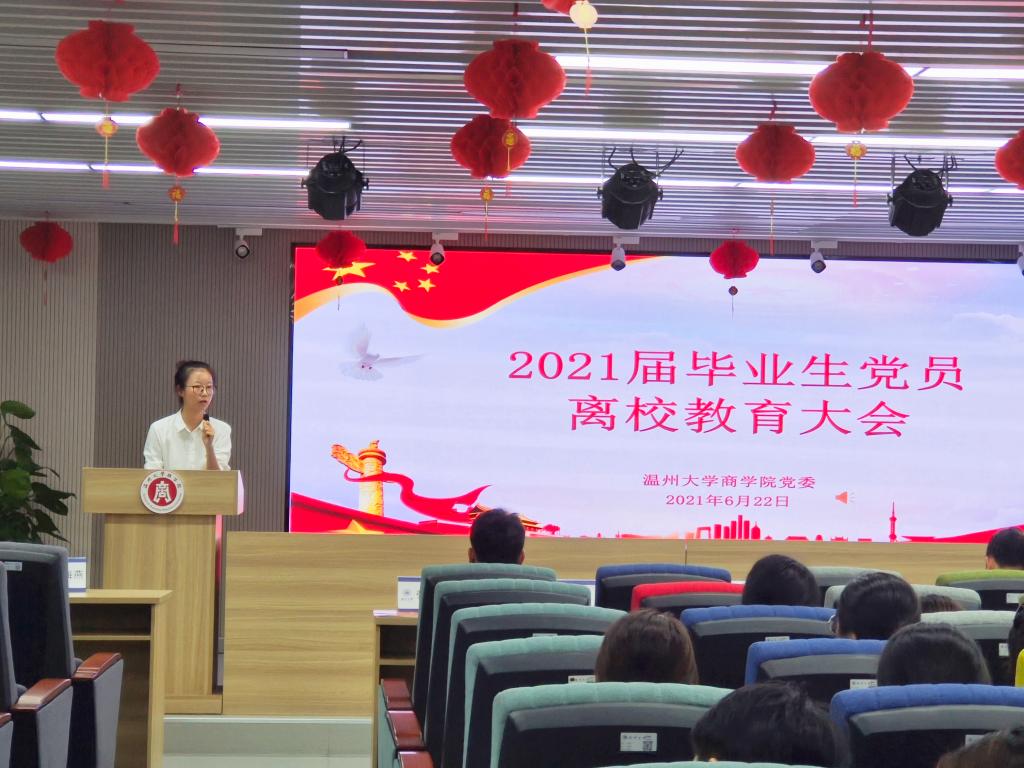 大会最后,各支部书记老师代表公司党委向97位毕业生党员颁发纪念卡。聂海燕老师讲解到,“纪念卡一面印有入党誓词,希望毕业生党员同志们能够坚定信念,不忘初心;一面印有对毕业生党员同志们的寄托,希望你们未来无论身在何方,都能够讲好温大故事和商院故事。”同时,也希望各位毕业生党员们能够在最后的时间里,协助老师们做好离校的各项工作,以实际行动让母校、公司放心,让党组织放心。