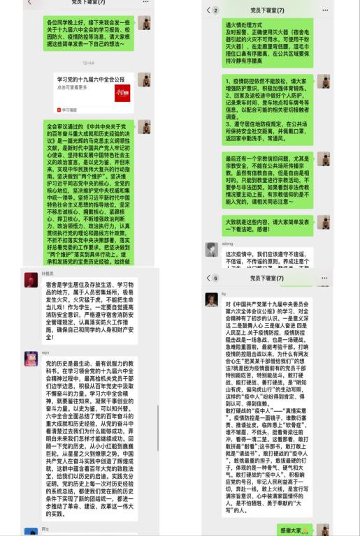 本次谈话从十九届六中全会精神、防诈骗、校园安全、宗教安全、生活等五个方面展开,首先让同学们学习并探讨了十九届六中全会精神,并发表自己的感想。这里摘录两位同学的感想。