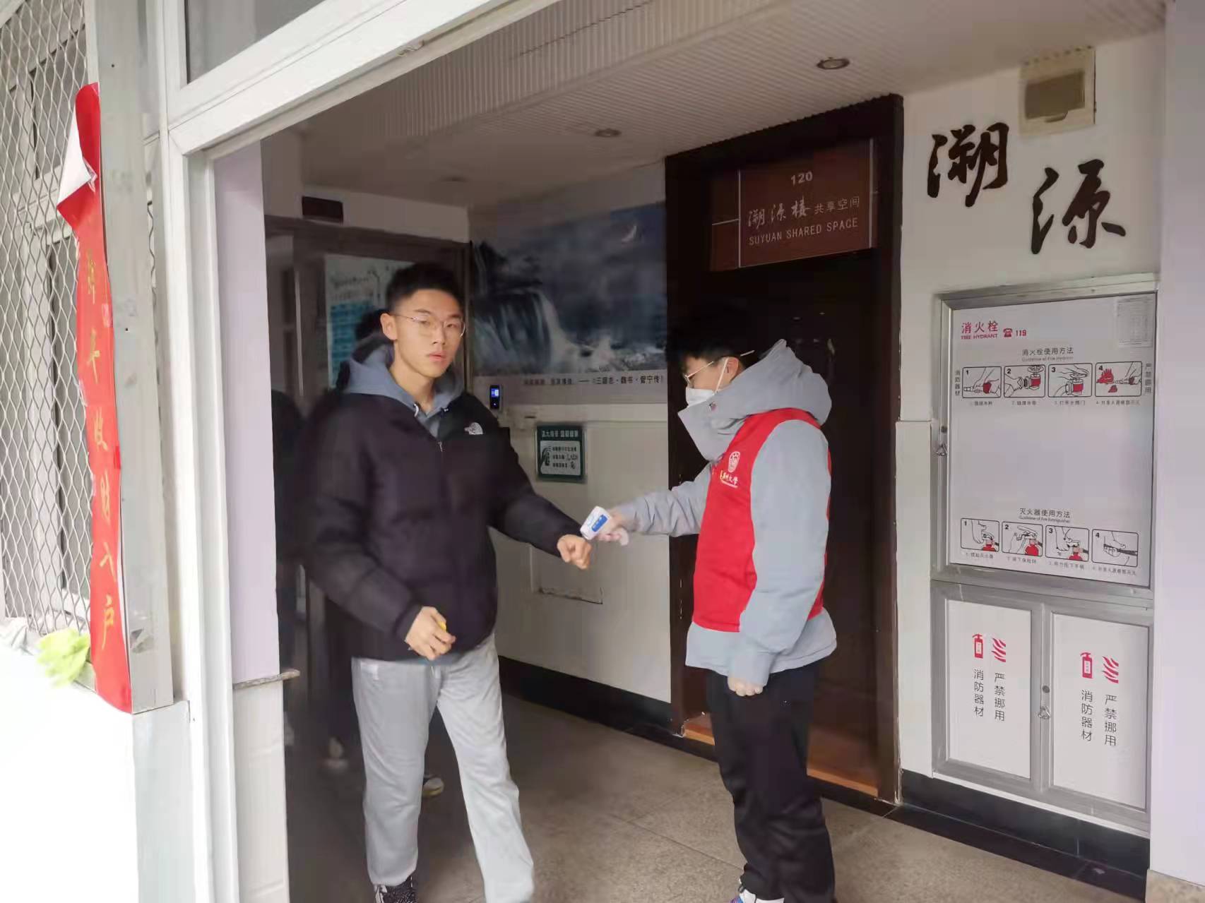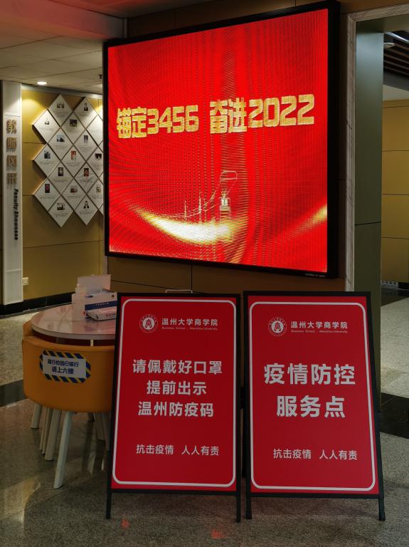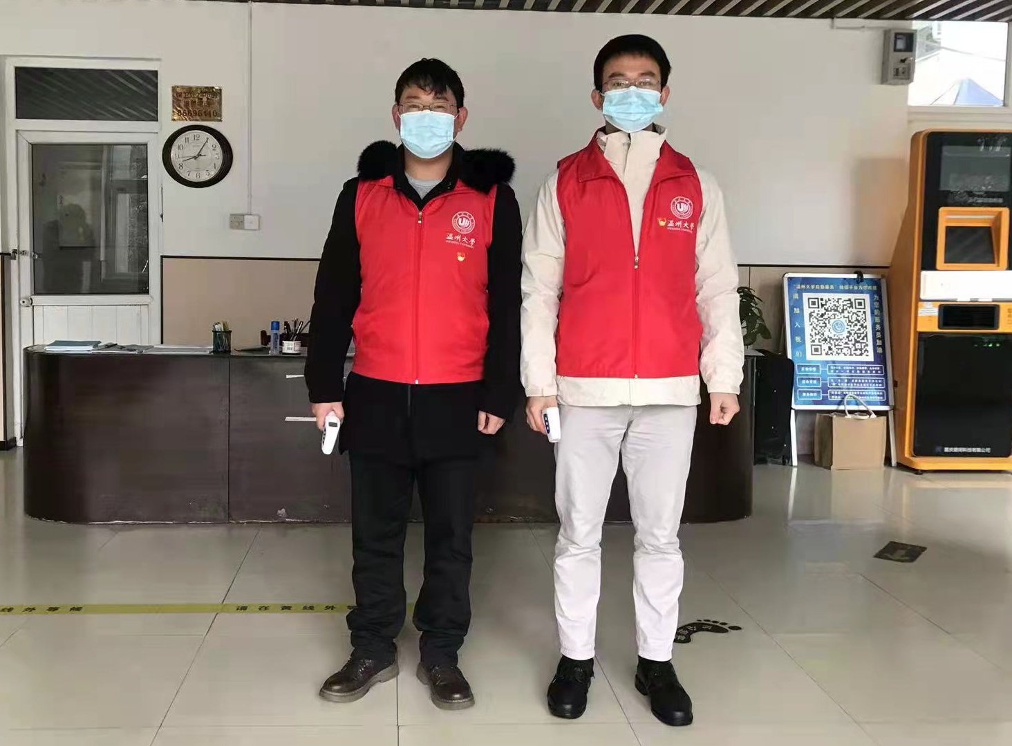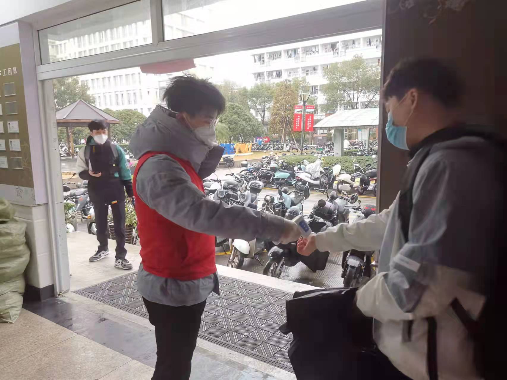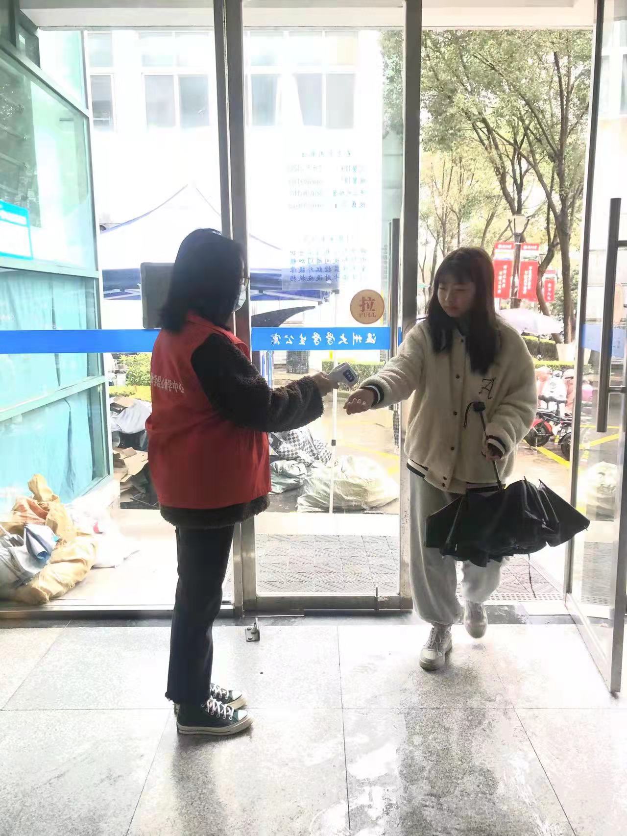 在公司二楼大厅,“党员服务岗”设立在醒目位置,党员志愿者身着红马甲,对出入师生测量体温,提醒佩戴口罩,并无偿提供口罩、消毒洗手液等防疫物资,用实际行动体现商院温度。