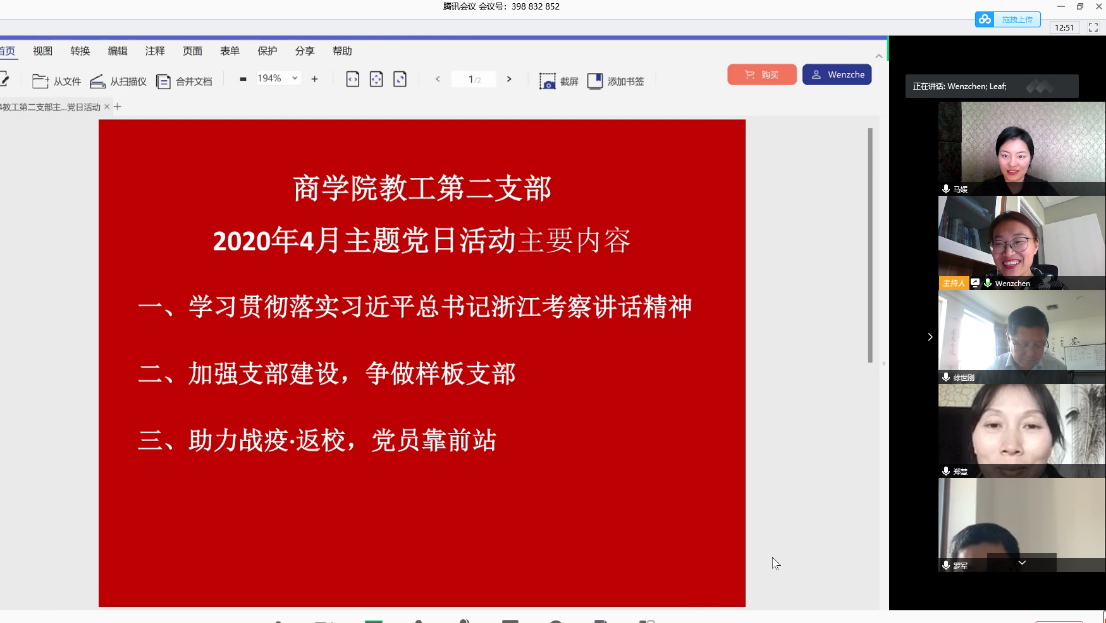 4月28日下午,3044永利教工第二支部利用腾讯会议开展了线上主题党日活动。支部8名党员参加会议,会议由支部书记陈文芝老师主持。