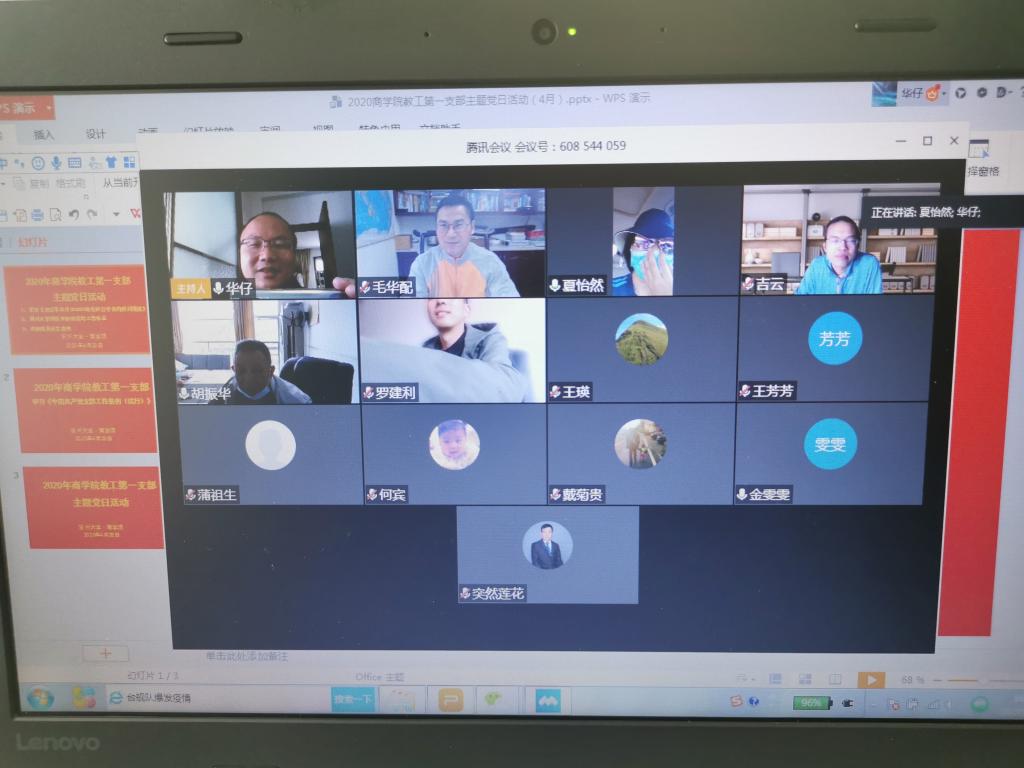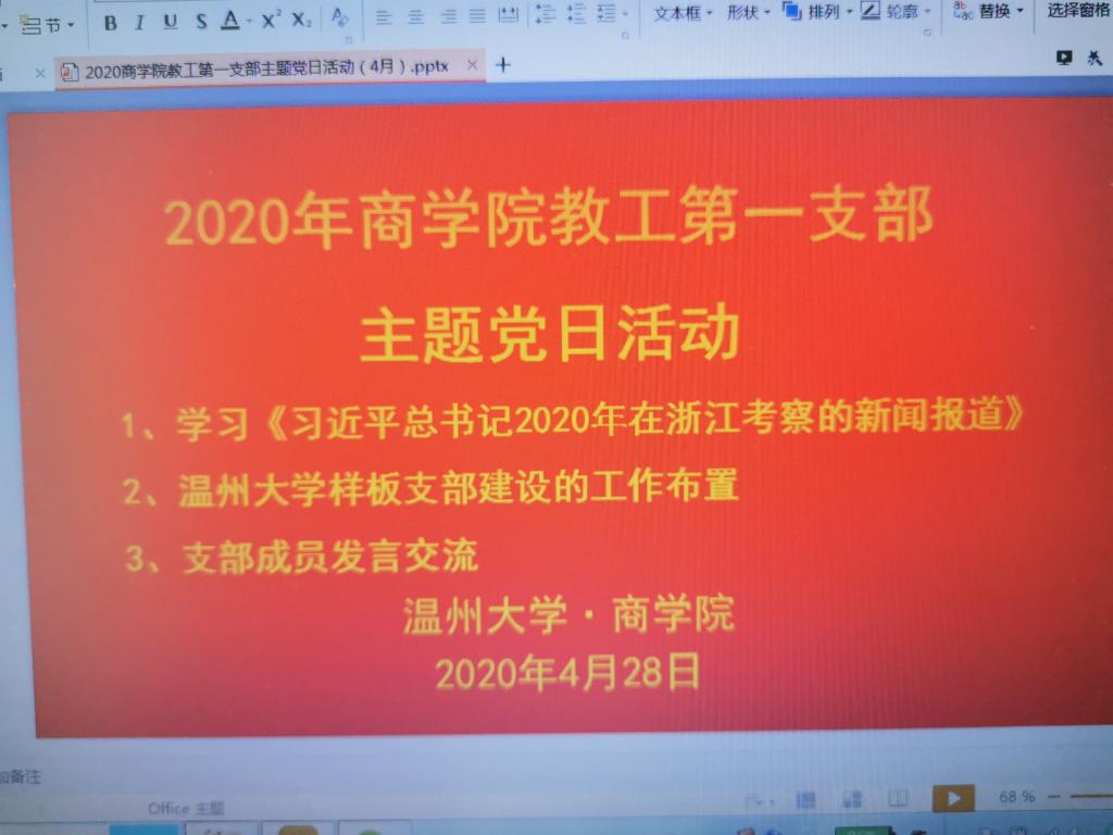 2020年4月28日下午,3044永利教工第一党支部召开4月主题党日活动,学习习近平总书记在浙江考察的重要讲话和精神,会议以腾讯会议的形式进行。