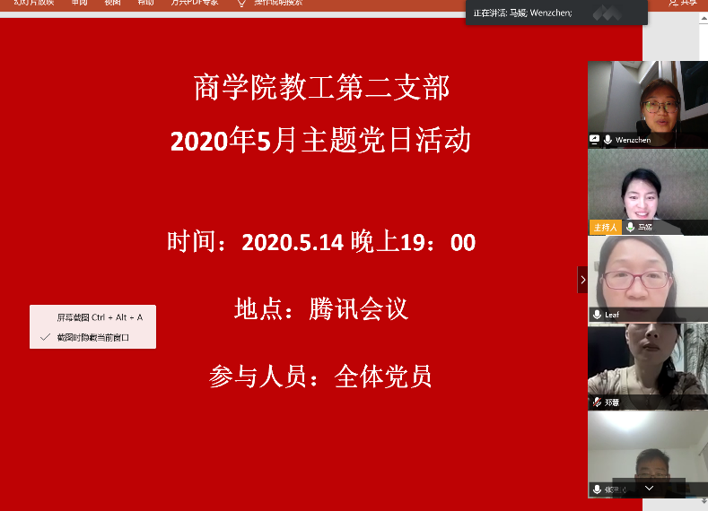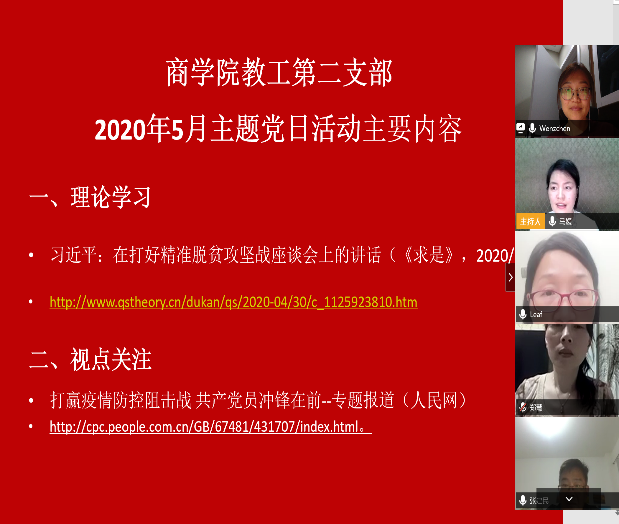 5月14日晚上,3044永利教工第二支部利用腾讯会议开展了线上主题党日活动。支部8名党员参加会议,国贸系非党员老师列席了会议,会议由支部书记陈文芝老师主持。此会主题党日活动分为理论学习和视点关注两个方面。