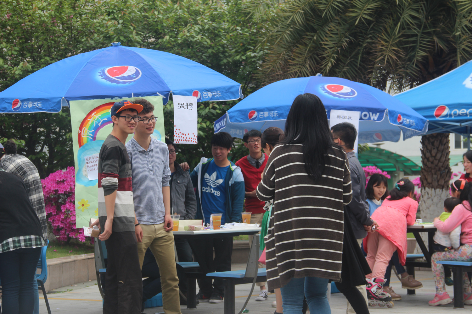 “咦?百分百创业协会的桌子上怎么放着几大瓶矿泉水?论一杯水如何用嘴巴倒入另一杯水中?”好奇的同学们迫不及待地想要体验这个项目,但是这可不是一个简单的项目。它需要的不只是两个人之间的相互协作,更是头脑和技巧的反应,看着每一张急切而又狰狞的脸庞,瞬间意识到了每滴水都来之不易的道理。不一会儿,入场券就被盖上一个个不同的印章,同学们在欢乐之余还能抽个奖,这使得更多公司的同学都前来参与,凉亭瞬间弥漫着热闹的气息。