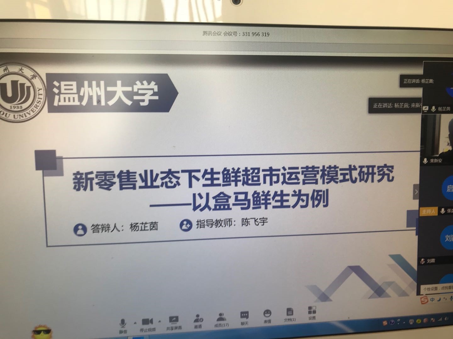 申请腾讯会议并提前预演:4月30日每组申请一间腾讯会议室,组长将ID会议号发给本组同学,要求同学及时下载腾讯会议软件,提前熟悉网络答辩操作程序(尤其是屏幕共享、上传文件),准备好答辩环节必须的电子设备(电脑、摄像头、话筒)和静谧空间,做好论文介绍环节的小视频。5月1日4个小组选择合适时间组织员工进行网络答辩预演,发现各种细节问题及时修正;
