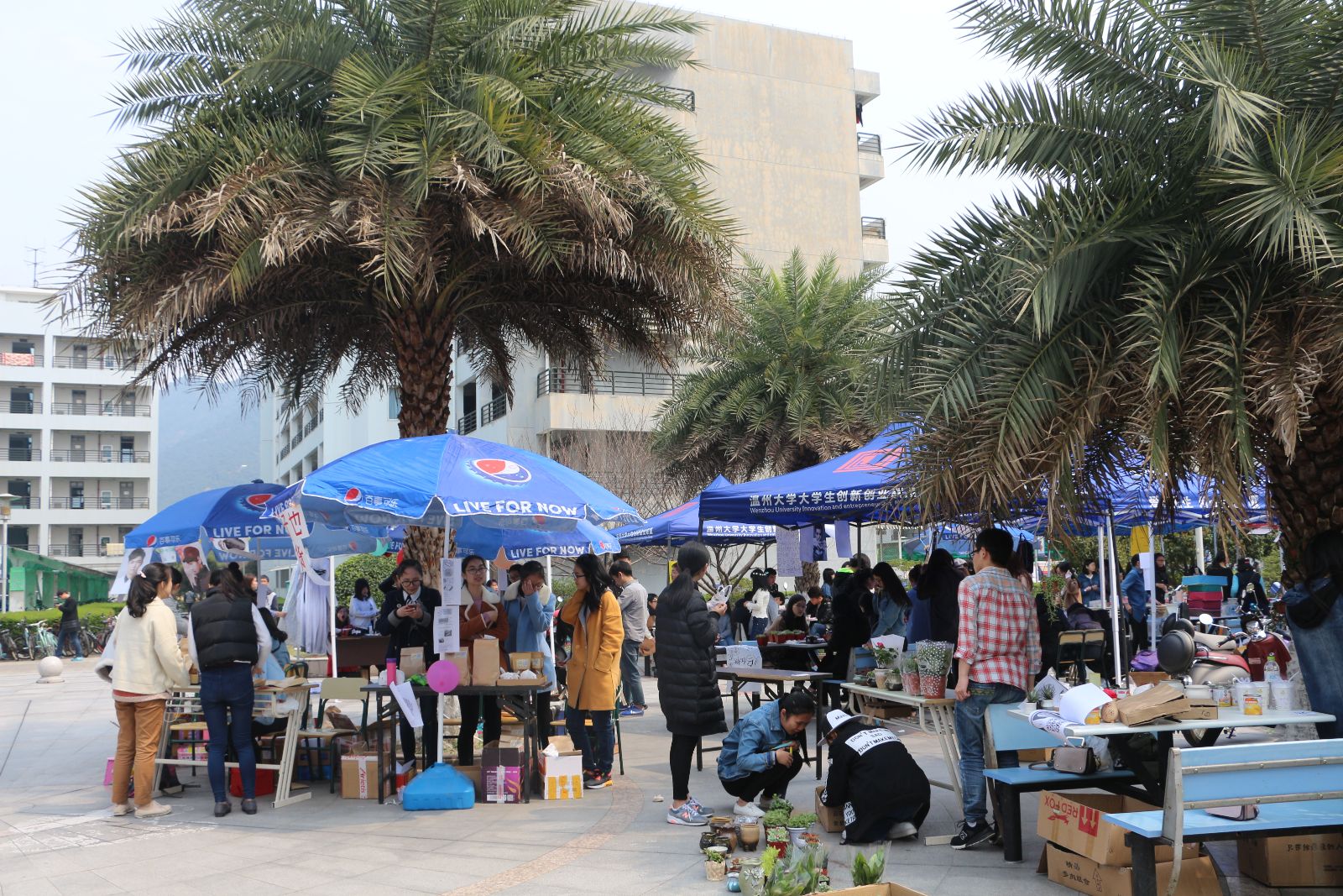 在准备好繁琐的前期工作后,44组摊位很快各就各位,整理好了自己的摊位。万事俱备,只欠东风。热闹的活动气氛很快就成功地引起了过往同学们的注意,越来越多的同学前来参观选购,跳蚤市场熙熙攘攘,热闹非凡。