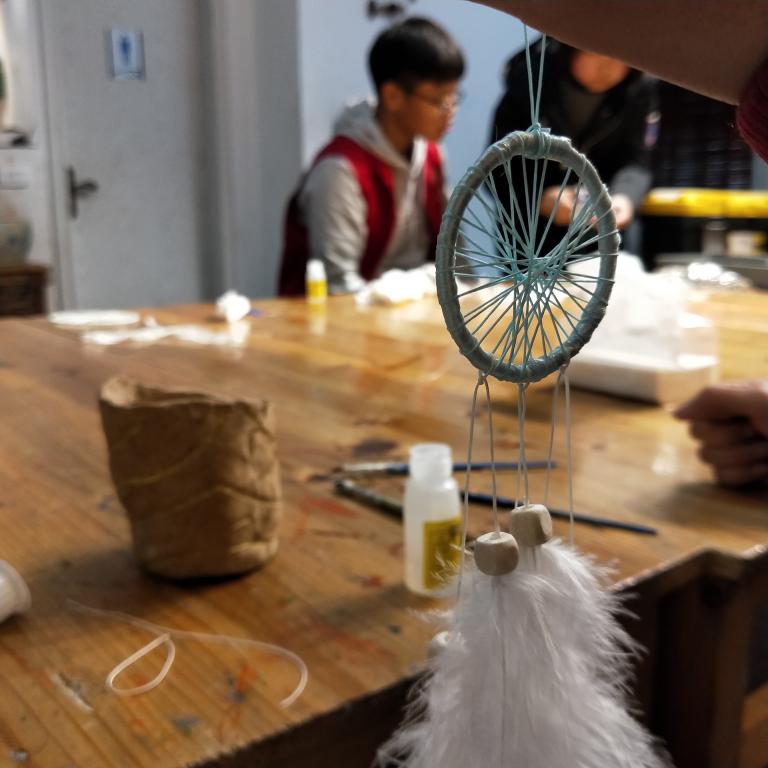 今天的课堂内容是捕梦网的制作。看着老师拿出的范本,蓝经灵志愿者们和孩子们都擦亮眼睛观察,竖起耳朵仔细聆听,一副跃跃欲试的样子。在孩子们选择了各自喜欢的材料后,志愿者们先贴心地搭配好挂件,如一些小铁环、丝带、小木珠、羽毛等小装饰,接下来就由孩子们自己动手缠绕丝带,他们全神贯注、心无旁骛地编织着他们的梦之网,之后又小心翼翼地用胶水粘合羽毛。在这期间,配对的志愿者们也在协助孩子们完成作品,他们互帮互助,通过精心设计、细致粘合,一个个精美而梦幻的捕梦网编制而成。在完成精巧的作品后,蓝经灵志愿者们和孩子们一同帮老师清理笔尖的胶水和杂乱的桌面。最后,志愿者们与老师孩子们微笑着合影留念。