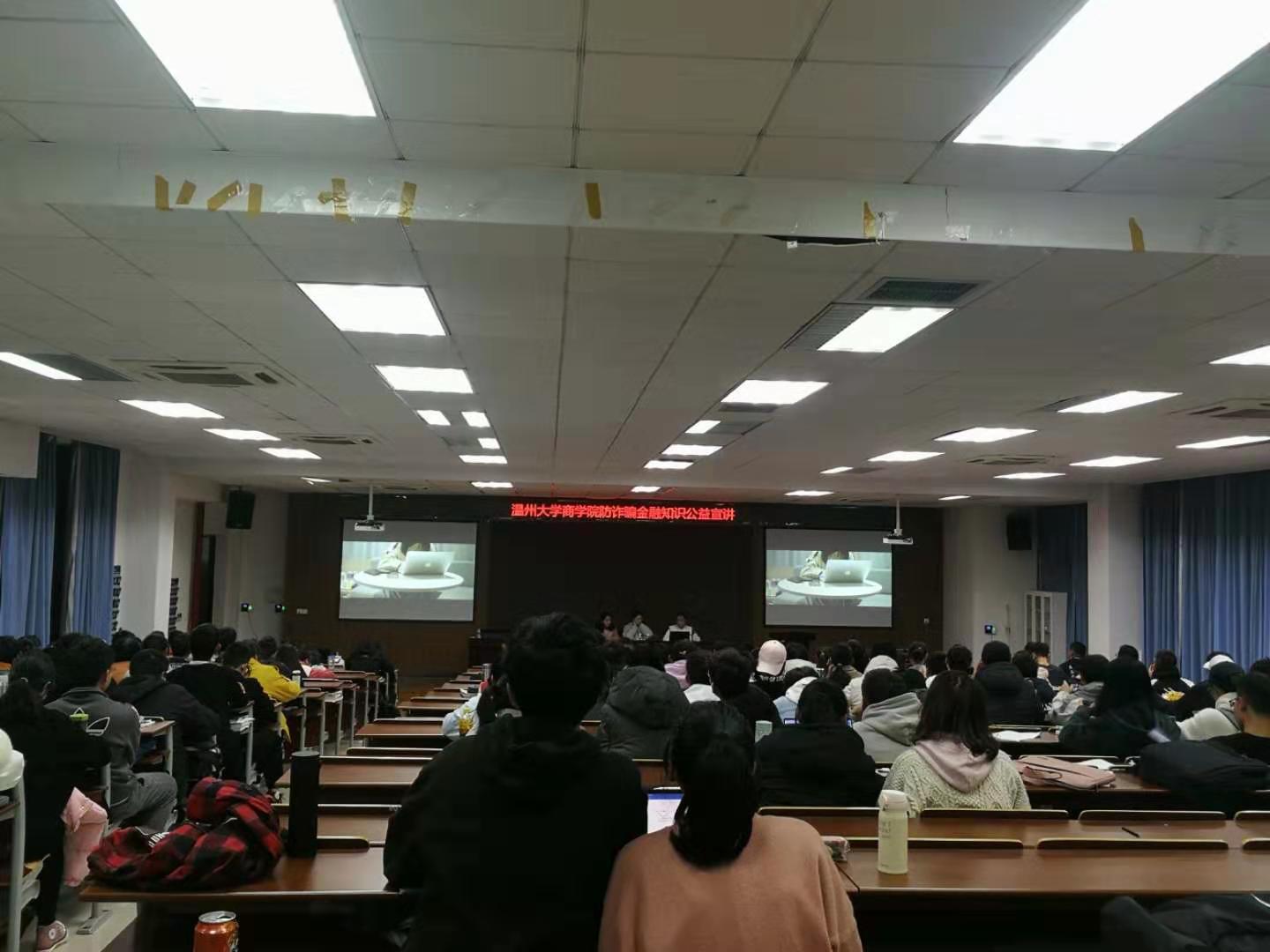 12月12日,温大商院金融公益宣讲团在3044永利集团南校区开展了以“警惕校园诈骗,远离套路贷”和“关爱信用记录,保护个人信息”为主题的金融安全知识讲座。本次讲座到场的观众是来自化学与材料工程公司的同学们。