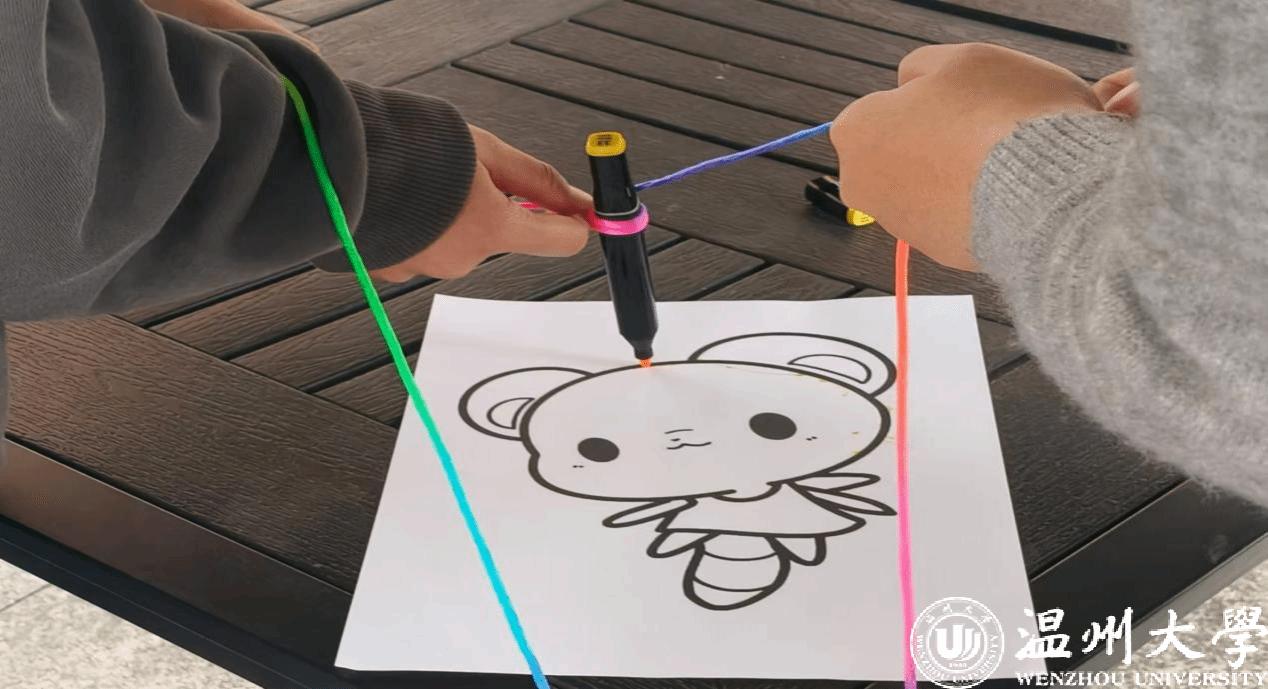 最后,活动迎来了“悬空作画”的高潮环节。在这个环节中,同学们选择一幅简笔画进行临摹挑战,通过将马克笔固定在绳子上,每位同学抓住绳子的两端或一端,利用绳子牵引来完成画作,手部不能直接接触笔身。这个环节不仅考验了同学们的团队协作能力,也激发了他们的创新思维,充分体现了合作与创意的双重挑战。