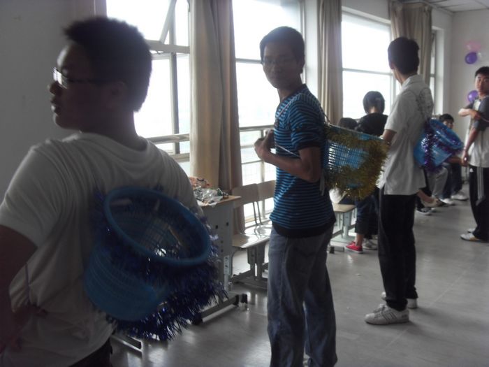 第二个游戏则为抛绣球,每组出两男两女,男同学将筐背好,女同学则将事先准备好的五彩气球在规定范围内竟可能多的抛入到筐中,经过两组男女同学的齐心协力,抛入筐中的球数量都很可观,不过第一组一十多球的优势战胜了第二个活动。经过两场比赛,两组不分上下。
