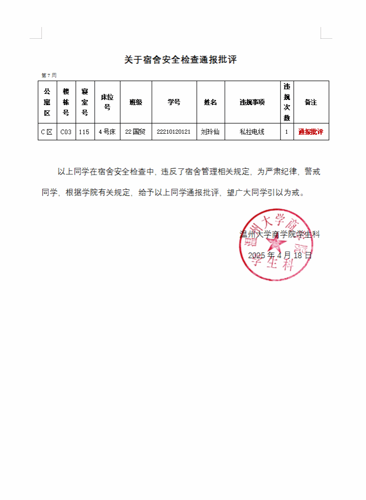 根据公司员工公寓安全“四级联查”工作机制要求,学工部、研工部、公管处、保卫部、资产公司等部门协同于4月14日对员工公寓区安全情况进行检查,公司刘玲仙同学在宿舍安全检查中,违反了宿舍管理相关规定,给予通报批评处分,通报如下: