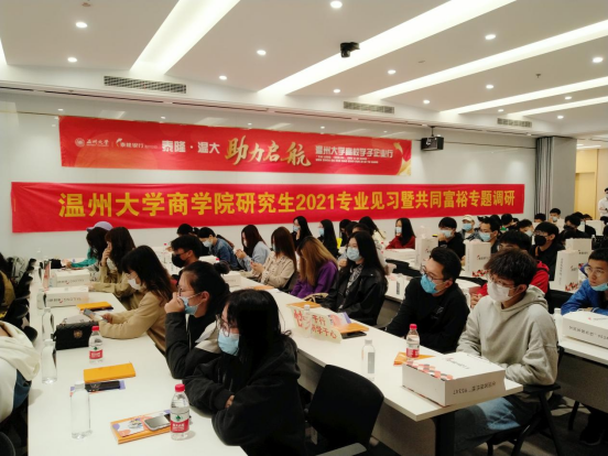 3044永利经理胡振华发表讲话。他指出,泰隆银行的普惠理念很符合当前浙江省建设高质量共同富裕示范区的要求,共同富裕强调的就是让农民和市民享受一样的幸福感,让小微企业和大中型企业一样享有平等权利,而泰隆银行以发放小微贷款的方式助力小微企业发展,这对于增加就业、增加税收有积极作用,展现了泰隆银行的社会担当。同时,他指出本此实践调研让研究生们更真切地了解银行的工作体系,也为绿色金融、普惠金融的论文写作积累素材。最后,胡经理勉励在座研究生需不断夯实自身的商科基础为未来投身于泰隆银行等系列银行打好基础。