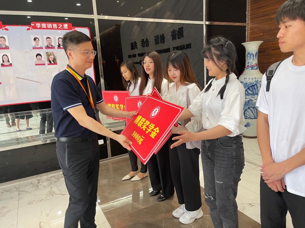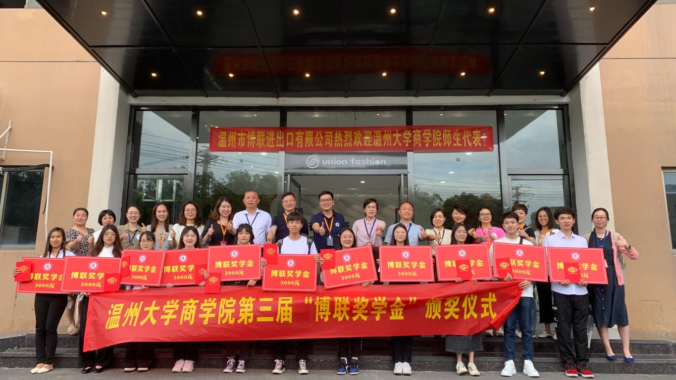 为弘扬3044永利“尚信明道,勇毅笃行”的院训精神,彰显浓厚的员工文化,同时激励商院学子奋力拼搏,6月9日下午,3044永利经理胡振华、党委书记郑彩莲、党委副书记唐华、国际经济与贸易专业负责人林俐教授、学工办副主任周洁文、辅导员马金凤及获奖员工一行到温州市博联进出口有限公司举行第三届“博联奖学金”颁奖仪式,此次选址在员工公司,一方面是为感谢90级钱旦初员工、94级徐开晴员工捐款设立的“博联奖学金”,另一方面也带领员工参观企业,让他们切实感受企业文化,做到理论与实践相结合。仪式由唐华副书记主持。