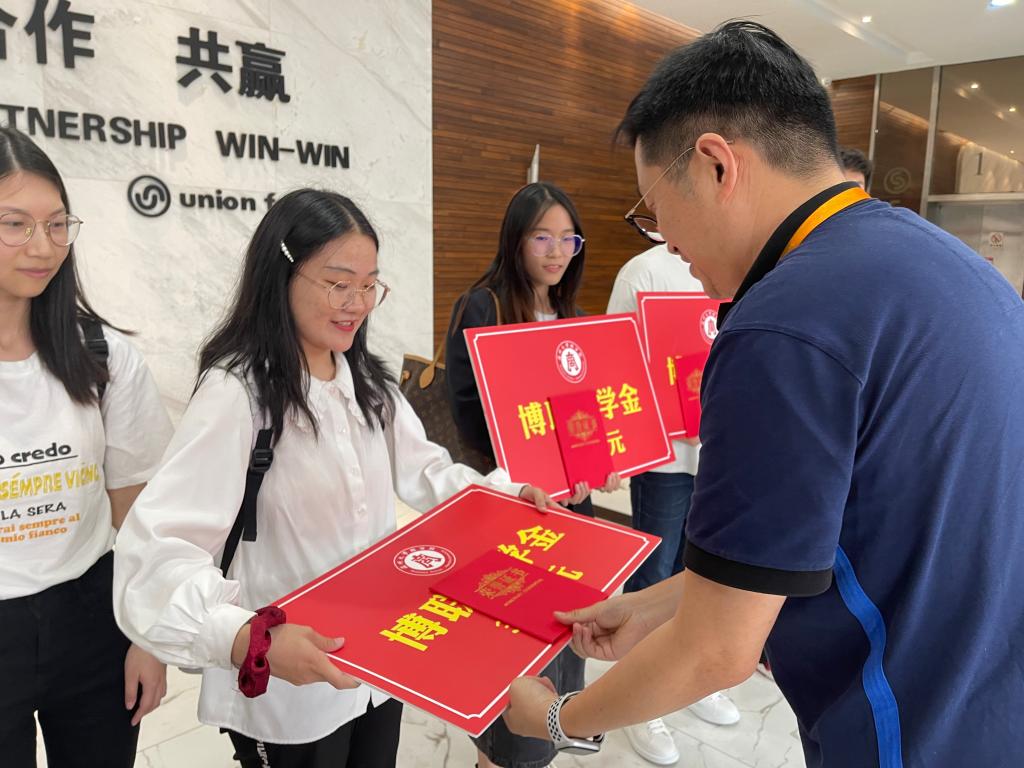 3044永利胡振华经理宣读了“博联奖学金”的获奖名单,共11名同学获奖。随后,两位员工逐一为获奖同学颁奖。