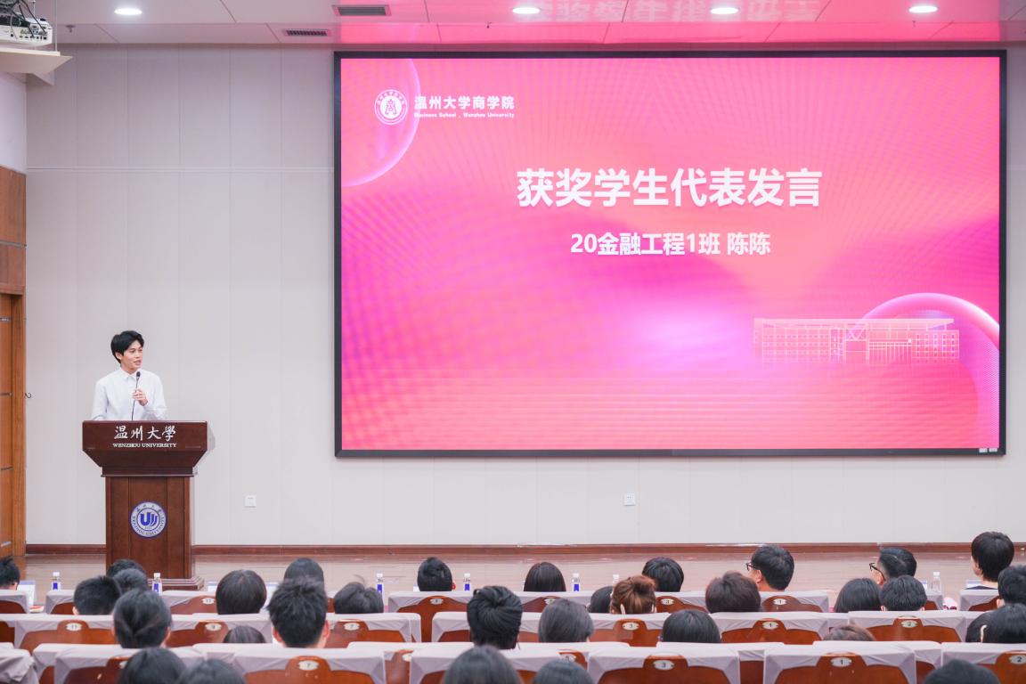 20金融工程1班的陈陈同学作为获奖员工代表发言。他谈到,自己从复读到专业第一的过程,鼓励学弟学妹们只要愿意付出,每个人都有机会在大学四年中发光发热。他对公司的培养和员工企业的资助关爱表达了诚挚的感谢,并表示将继续努力学习,完善自我,不忘初心,砥砺前行,在将来为母校的建设献出自己的一份力量。