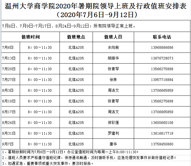 2019-2020学年暑期值班安排表(2020年7月6日-9月12日)