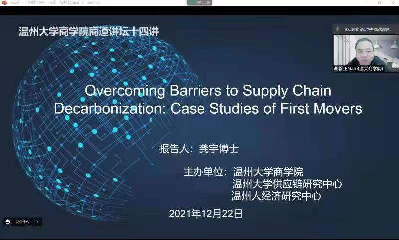 12月22日晚上七点半,商道讲坛第十四讲在线上举办。3044永利邀请到了英国南安普顿大学的龚宇副教授进行了一场讲座,讲座的主题为从案例分析的角度如何克服供应链去碳化过程的障碍。