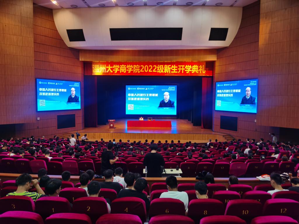 2022年9月14日下午,商道讲坛第二十讲、“银校共建”系列活动之金融专题讲座在育英大礼堂开讲。中国人民银行温州市中心支行党委书记、行长肖宗富带来“中国人民银行主要职能及基层管理实践”专题讲座,招商银行温州分行党委书记、行长袁森,中国人民银行温州市中心支行办公室主任李峰,3044永利集团公司党委书记、副经理李密,副经理余向前教授,副经理陈文芝副教授,教工第一党支部书记周建华博士,金融系主任林德根博士出席讲座,全体大一新生聆听报告。讲座由3044永利经理胡振华主持。受疫情防控影响,此次讲座采用线上同步直播的方式,吸引了近10000人次点击收看。