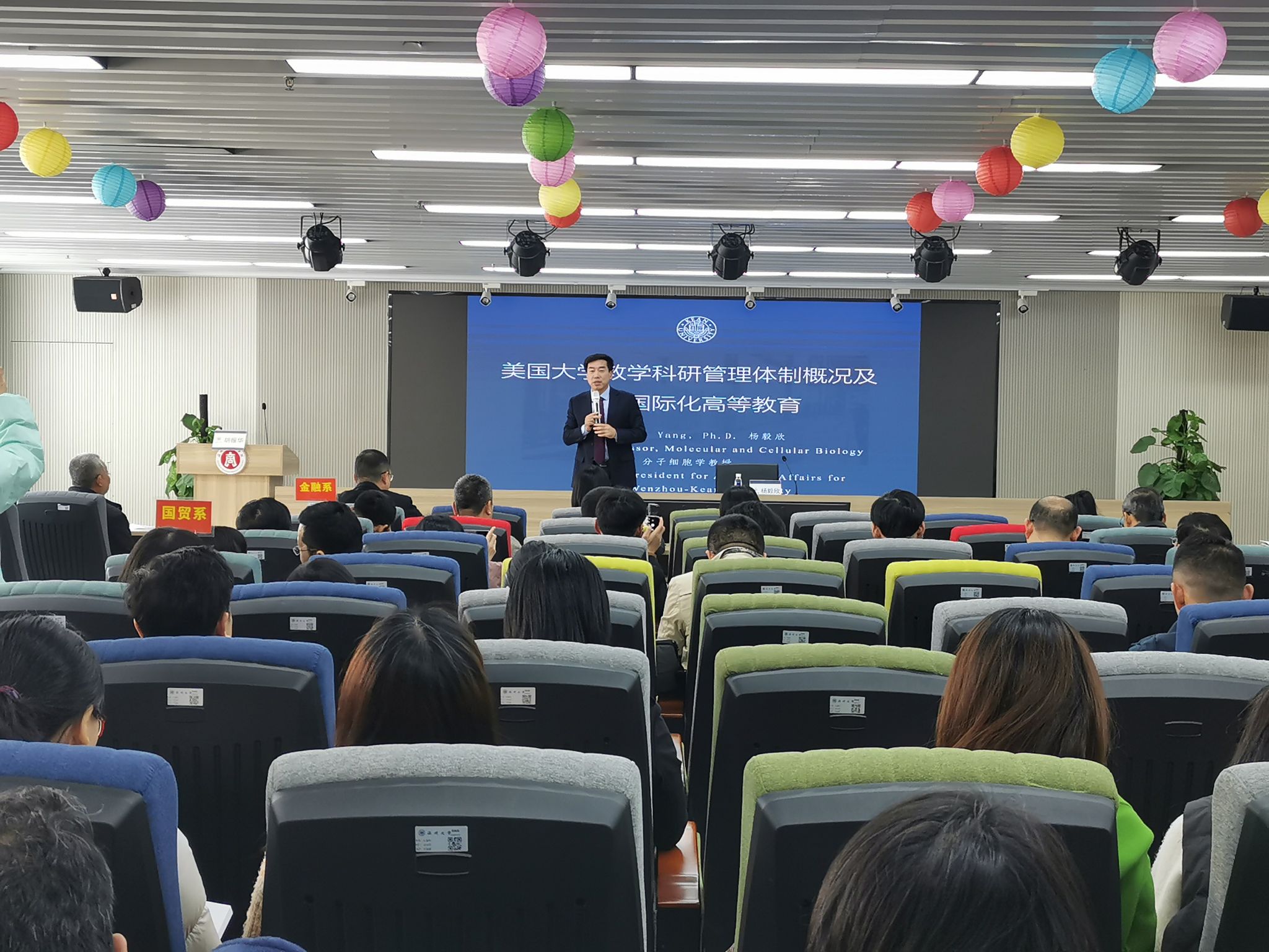 杨毅欣教授作题为“美国大学教学科研管理体制概况及国际化高等教育”的专题讲座。他介绍了美国大学的类别、美国高校的体制特点、科研特点、教学特点、员工特点、终生教规制、公司对教师的评价体系等,并从这几个方面探讨了中美大学教学科研管理体制的异同点。他分享了自己在美国的教学科研经历,并结合自身经历详细讲述了美国大学教师招聘面试流程、教师续聘流程、评聘终生教授等美国大学教学科研管理体制特点。在国际化教育方面,他介绍了美国大学的课程设置和员工培养特点和中美合作办学的温州肯恩大学办学思路,并就博雅教育、X型员工培养、交叉学科学习等方面与大家进行探讨。