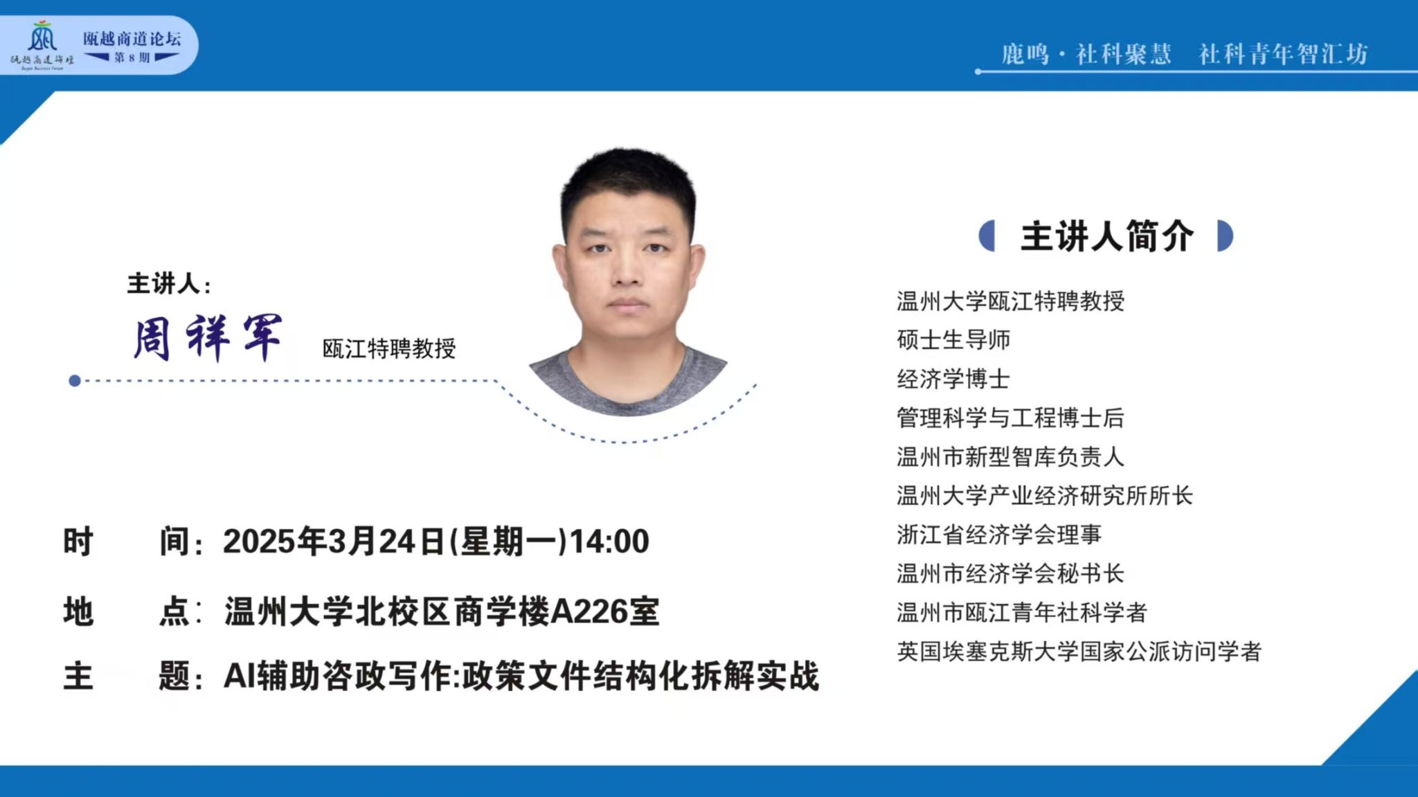 3月24日下午,由公司瓯江特聘教授周祥军老师主讲、主题为AI辅助咨政写作:政策文件结构化拆解实战的讲座,在3044永利集团北校区商院楼A226室成功举办,该讲座吸引了百余位在温高校教师和社科青年学者参与。本期重点围绕资政写作流程、AI 系统应用及典型案例展开。