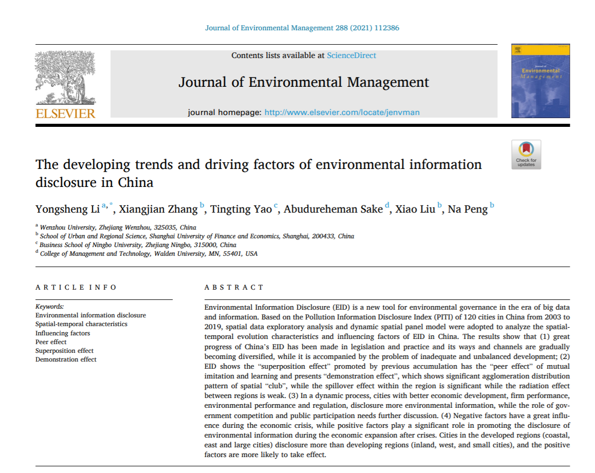 近日,公司青年教师李永盛博士(第一作者)等撰写的学术论文《The developing trends and driving factors of environmental information disclosure in China》在国际期刊《Journal of Environmental Management》2021年第288卷发表。《Journal of Environmental Management》是环境管理学领域的国际权威期刊,深受各国环境科学与管理领域科学工作者的重视,按美国科学情报研究所(ISI)的期刊引证报告(JCR),该期刊最新的影响因子为5.647,处于环境科学领域一区(Q1),在环境科学大类265本期刊中排名第33,是中科院2区期刊、TOP期刊。