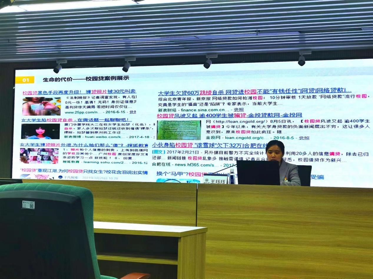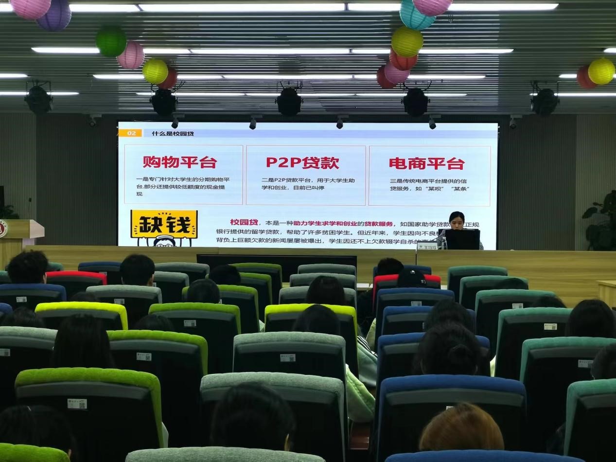 王珏珏老师主要从“生命的代价”“什么是校园贷”“校园贷危害”“如何拒绝不良校园贷”“理性消费”等五个方面展开。讲座伊始,王老师引用了典型的老员工不良校园贷案例,展示了不良校园贷给员工、家庭乃至社会带来的危害,如辍学、跳楼、自杀、卖器官等,告诫同学们要警惕“蝇头小利”,自觉抵制诱惑,远离校园贷,避免上当受骗。