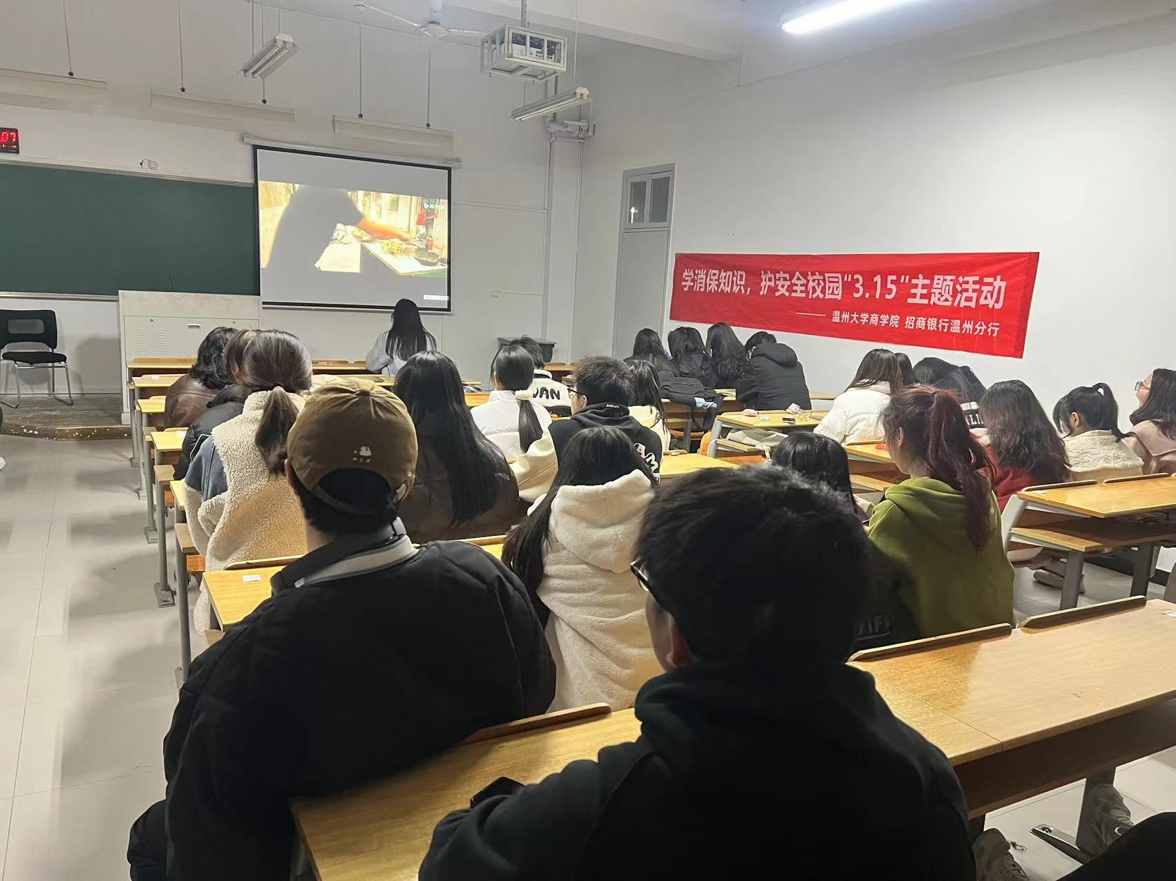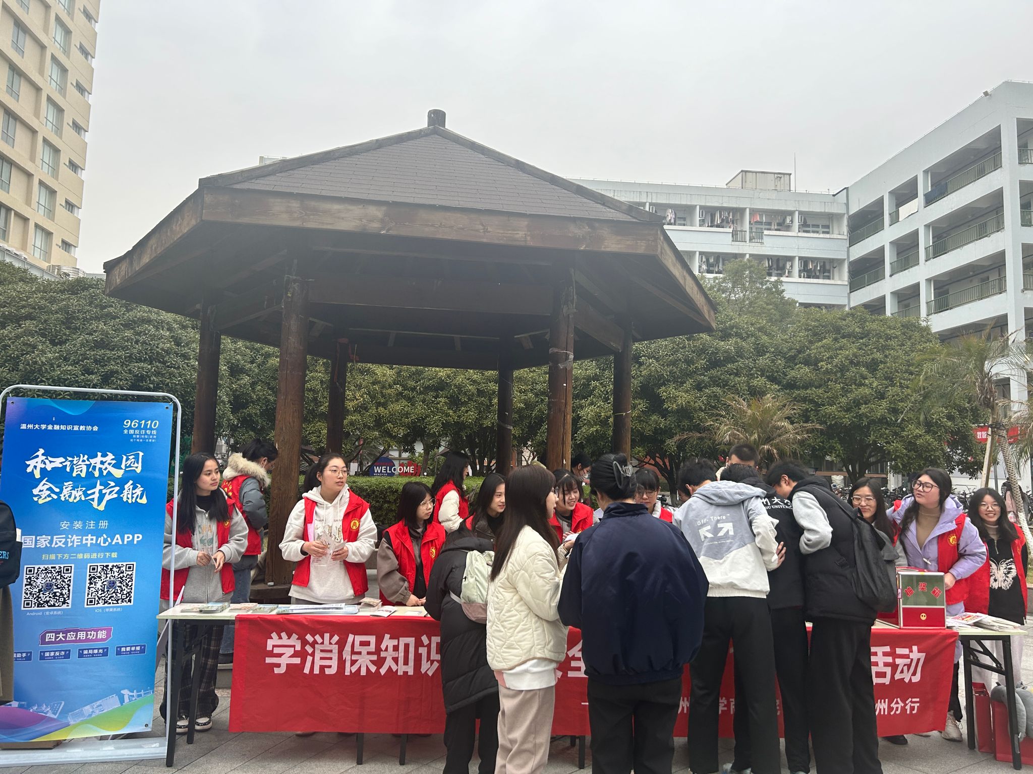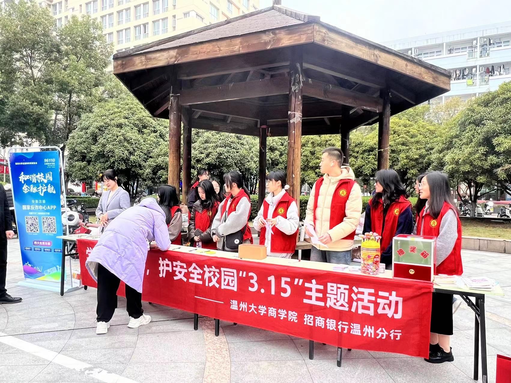 “当同学们遇到消费者权益被侵犯时,请拨打电话12315进行合理维权……”,协会联合招商银行温州分行开展一场“学消保知识,护安全校园”主题宣传活动。活动现场,协会成员与银行工作人员采取悬挂宣传标语、发放宣传手册等多种形式向同学们普及“国际消费者权益日”的发展历史与意义。此外,协会还特意围绕《消费者权益保护法》等法律法规知识开展了有奖竞答活动。银行工作人员现场为员工详细解读宣传折页,并结合员工日常生活遇到的问题予以一一解答。
