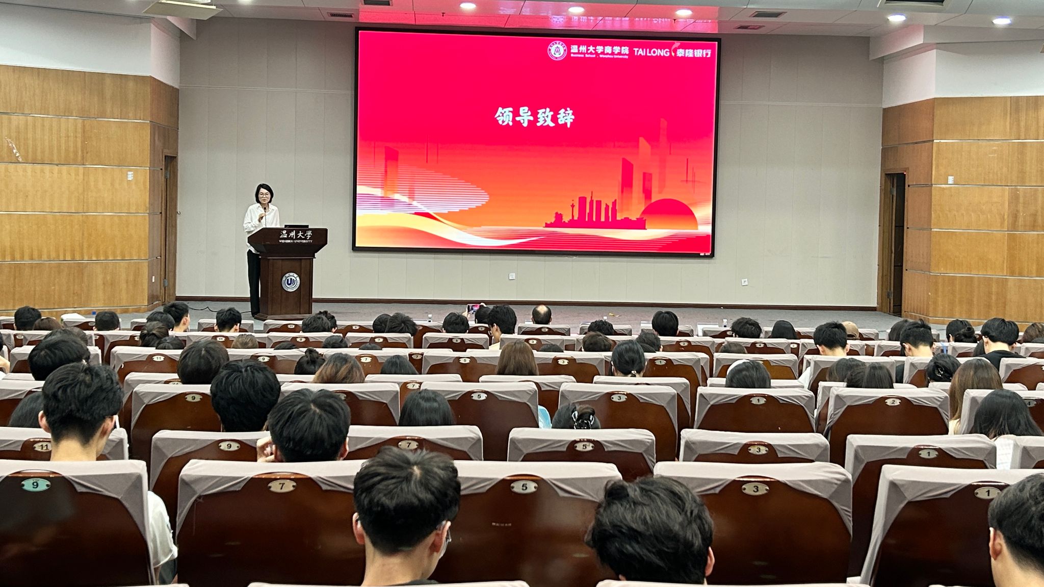 其次,唐华副书记和陈贞纯经理为师生代表颁发聘书。泰隆银行温州分行陆静烨女士作为导师代表发言。她讲述了泰隆银行对员工培育的重视及包容,还介绍了其独特的帮带文化,通过“老带新”助力一代代新员工茁壮成长。针对本次行动,陆静烨导师希望与同学们共同进步,也真诚欢迎同学们。