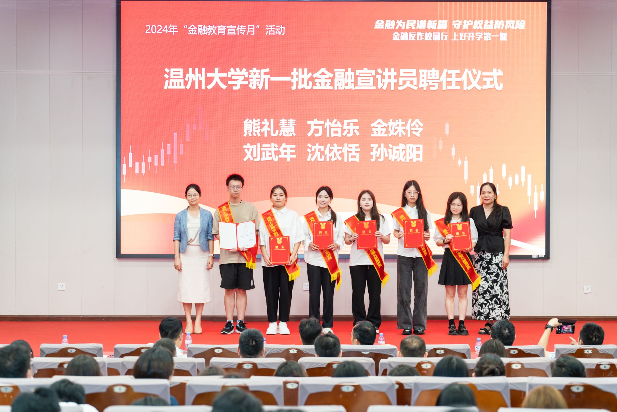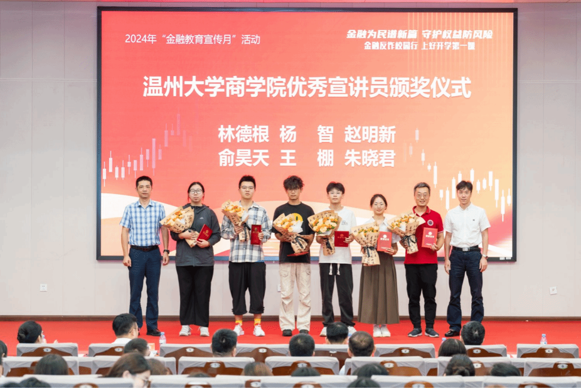 为了肯定金融宣讲员的努力与付出,国家金融监督管理总局温州监管分局局长朱燕军和3044永利集团保卫部部长冯方盛为优秀宣讲员林德根、杨智、赵明新、俞昊天、王棚、朱晓君等6位师生颁发了荣誉证书。省级金融教育示范基地的建设需要一支人员充足、专业过硬、能力较强的宣讲团队,3044永利教工第一党支部书记熊礼慧,金融知识宣教协会成员方怡乐、金姝伶、刘武年、沈依恬、孙诚阳被聘请为新一批金融宣讲员。国家金融监督管理总局温州监管分局副局长钟洁慈和3044永利集团公司党委副书记曾蓓蕾为新一批金融宣讲员代表颁发聘书。