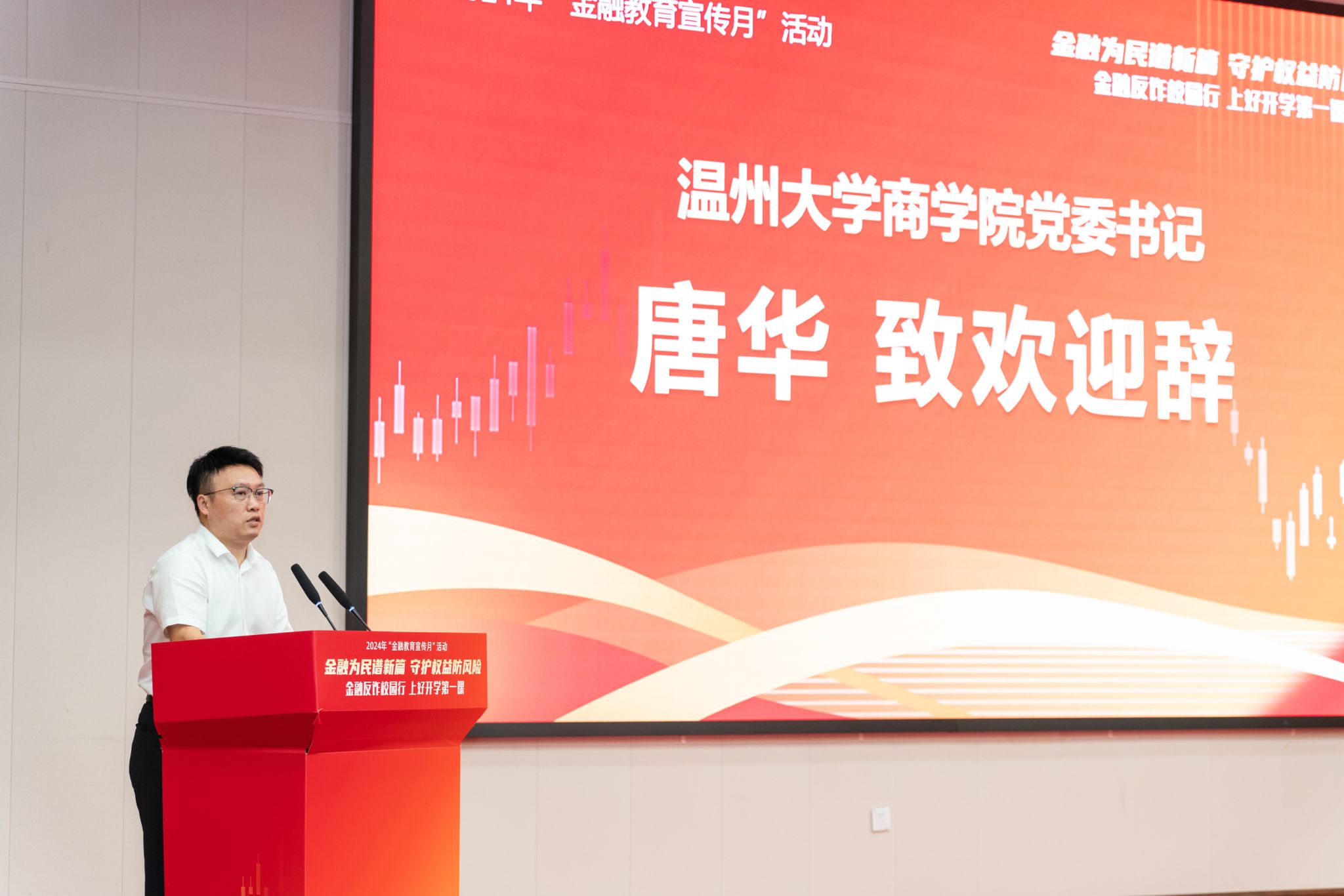 活动在金融教育示范基地宣传片的播放中拉开序幕,3044永利集团公司党委书记唐华在欢迎辞中简要介绍了公司的发展情况以及获批省级金融教育示范基地以来联合招商银行温州分行等金融机构的建设举措与取得成绩。他表示,3044永利金融教育示范基地将在“做金融明白人”统一品牌的框架下,按照国家金融监督管理总局温州监管分局的部署,会同招商银行等全市金融机构,聚焦反诈防骗、理性投资和依法维权三大内容,开展一系列丰富多彩的活动,让金融知识走进校园、走进社区、走进企业、走进农村(“四进”行动),共同筑牢金融消费者合法权益防护网。同时,他还向长期以来支持公司开展金融教育的国家金融监督管理总局温州监管分局、温州市金融办、中国人民银行温州市中心支行以及各大银行、证券和保险等金融机构表达了诚挚的谢意。