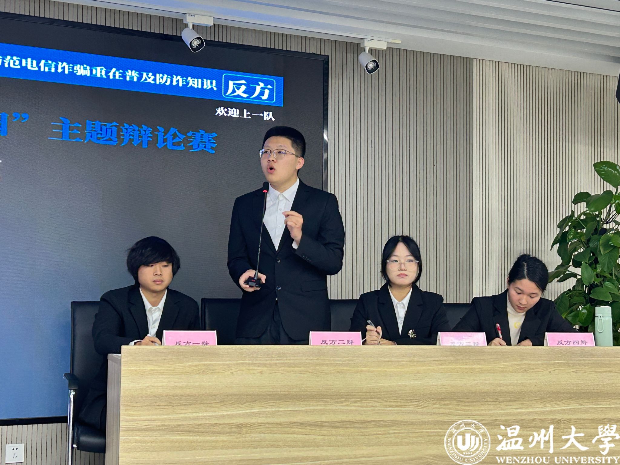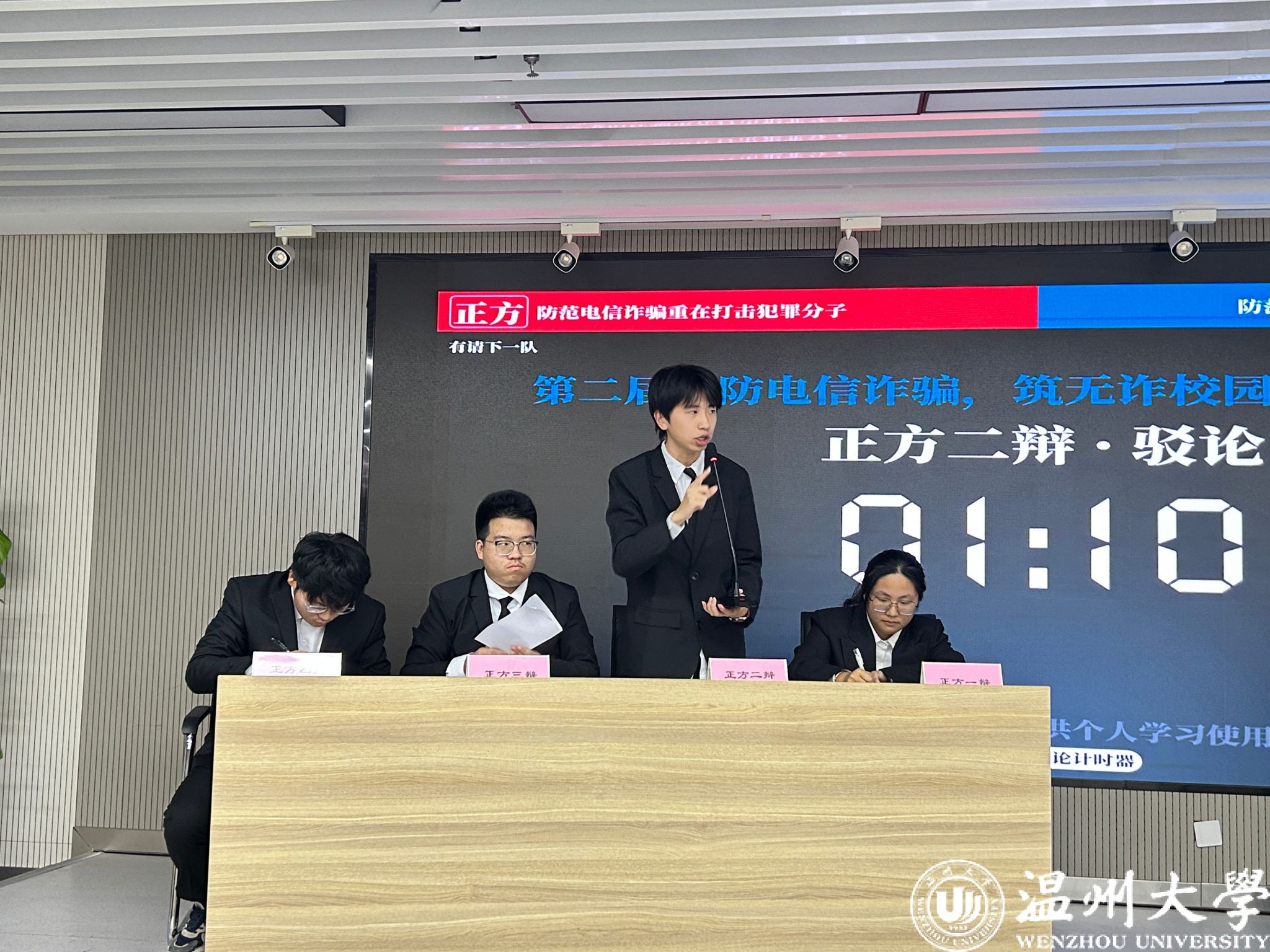 本次辩论决赛采用固定辩题“防范电信诈骗重在打击犯罪分子VS防范电信诈骗重在普及防诈知识”。正方由林珍缘、唐森浩、董思承、周子涵四位辩手组成。他们认为,防范电信诈骗重在打击犯罪分子,开篇便以坚定的口吻阐述打击犯罪分子对于遏制电信诈骗的关键作用。他们指出,犯罪分子是电信诈骗的直接实施者,只有对其进行精准打击,从源头上摧毁诈骗团伙,才能真正有效地降低诈骗案件的发生频率,守护人民的财产安全。反方由邓宇豪、黄元菊、樊想楠、杨皓云组成。他们认为,防范电信诈骗重在普及防诈知识。他们从普及防诈知识的角度展开论述,认为提升民众的防诈意识如同构筑坚固的防线,能够让诈骗分子无处遁形。