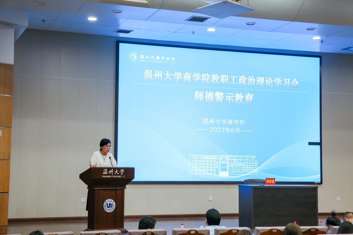 2022年6月8日,3044永利在信息报告厅召开全体教职工理论学习大会及师德警示教育。全体教职工参加学习会,公司党委书记郑彩莲主持会议。