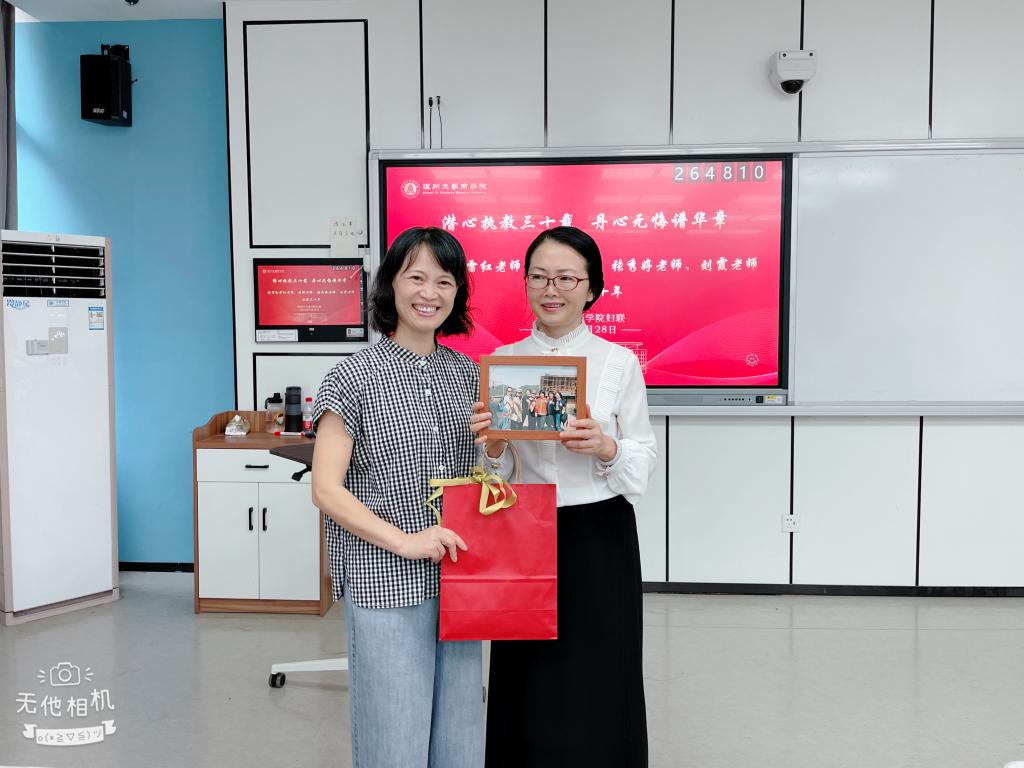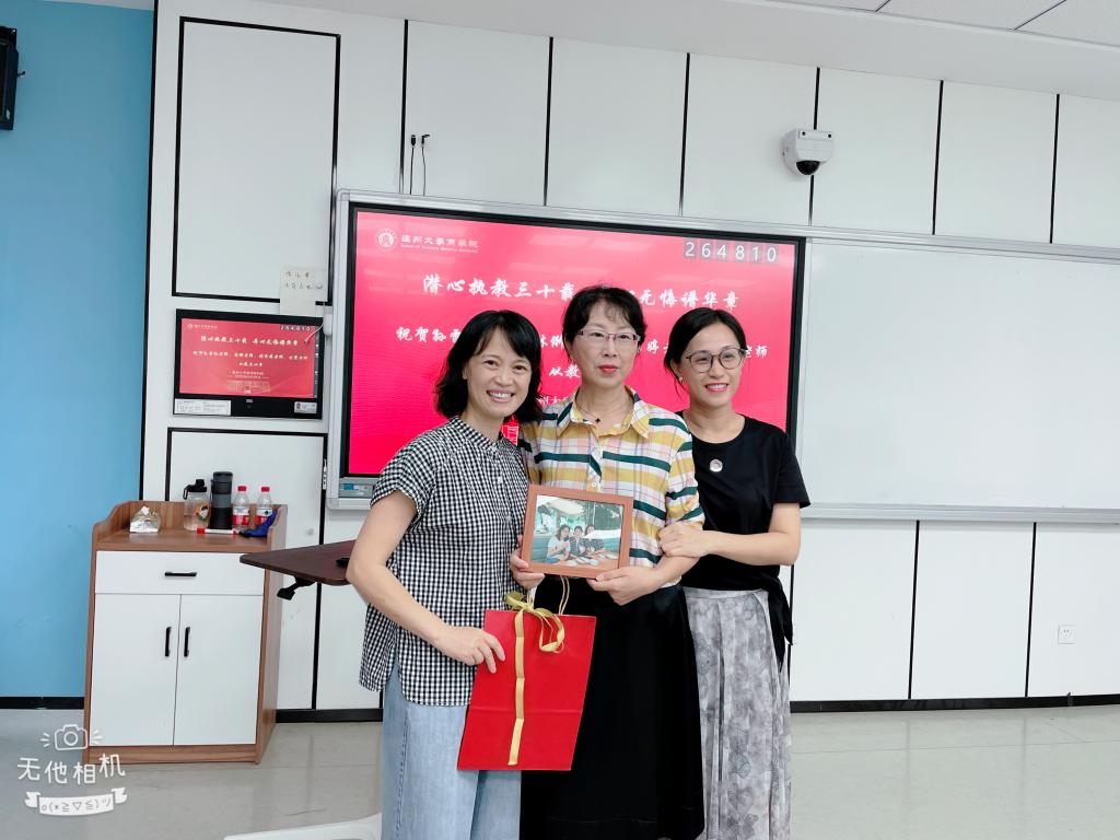 随后,妇联对公司四位教(工)龄超过30年的女教工 -- 张秀婷老师、孙雷红副教授、林俐教授、刘霞教授进行了表彰。四位老师入职30多年来,一直勤勤恳恳、兢兢业业,为公司的行政、教学、专业建设、员工课外竞赛等做出了很大的贡献。同事们纷纷回忆起与她们共事以来很多难忘的时刻,令人动容。为表达对她们的谢意,妇联也精心准备了礼物送给她们。