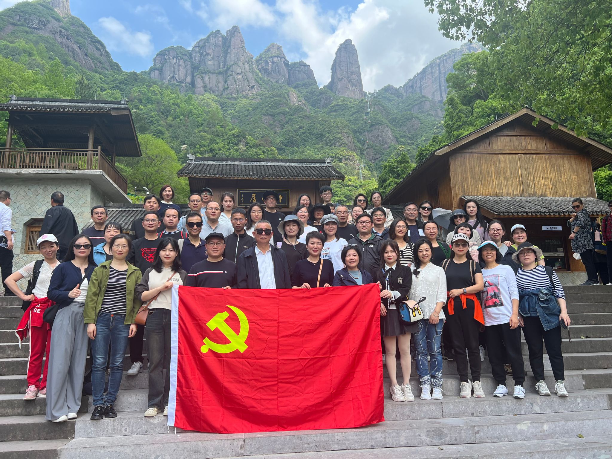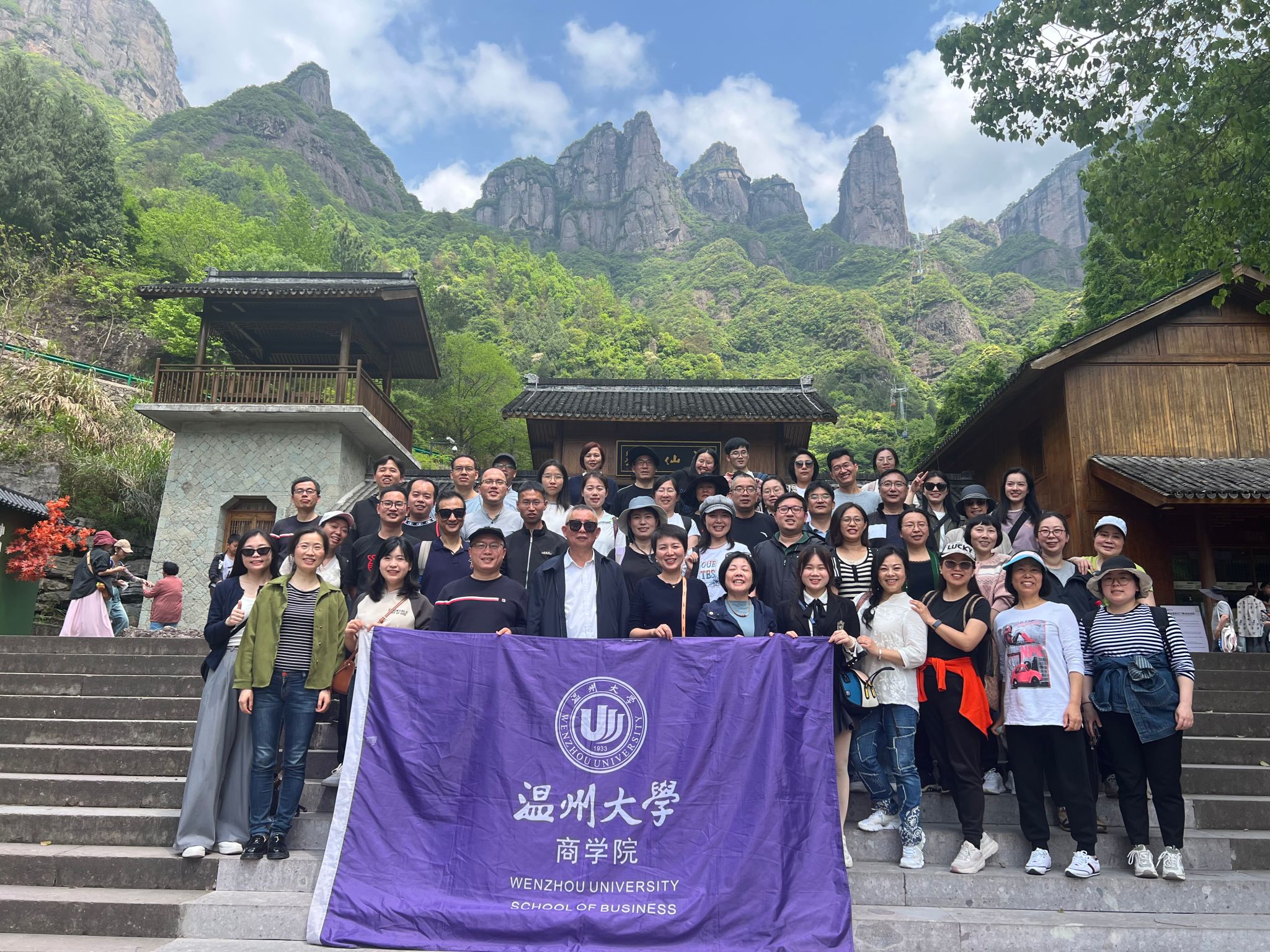 下午, 我们一行来到国家5A级风景区神仙居。神仙居地质构造独特,是世界上最大的火山流纹岩地貌集群,一山一水、一崖一洞、一石一峰,都能自成一格,形成奇观。悬崖峭壁之中氤氲着薄雾,网红打卡点如意桥更是让神仙居奇景尽收眼底,大好河山令人流连忘返。在景区门口合影留念后,纷纷开始自由组队登山,在南天索道处,大家又汇聚在一起乘坐缆车共同观赏山中景色,在到达山顶观景台和南天桥时,纷纷驻足留影、合照。游览了山上风景后,大家顺着步行道从山顶往山下走,可谓是上山易,下山难。